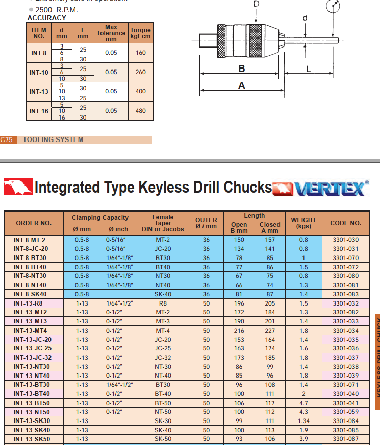 Integrated Type Keyless Drill Chucks Vertex INT-13 with BT40 tapper