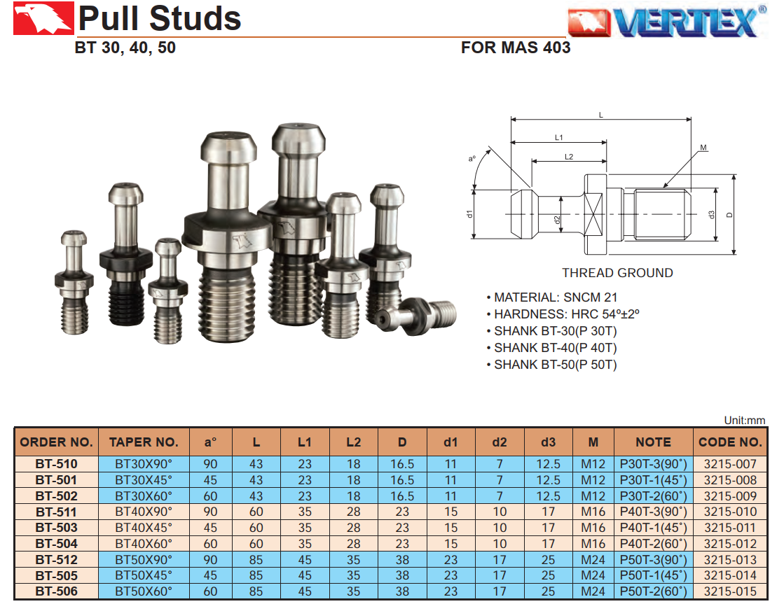 Pull Studs Vertex BT-503 (BT40x45° without hole)