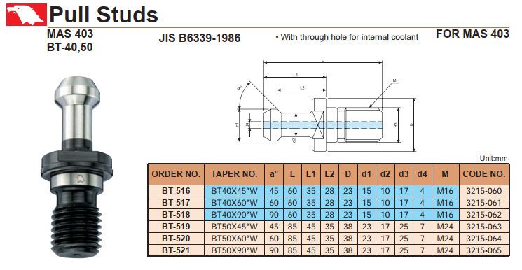 Pull Studs Vertex BT-516 (BT40x45°W with hole)